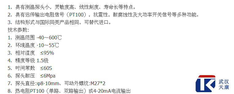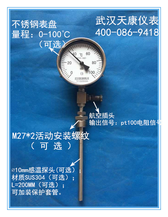 产品名称:远传液体压力式温度计(航空插头式) 产品型号:WTYY-1031 产品规格:L=200MM 温度范围:0-100℃ 连接方式:M27*2活动螺纹 (可根据具体实际需要定做) 品牌:J9九游会-(中国)真人游戏第一品牌 订货请注明:探杆长度L=?;温度范围;连接方式;