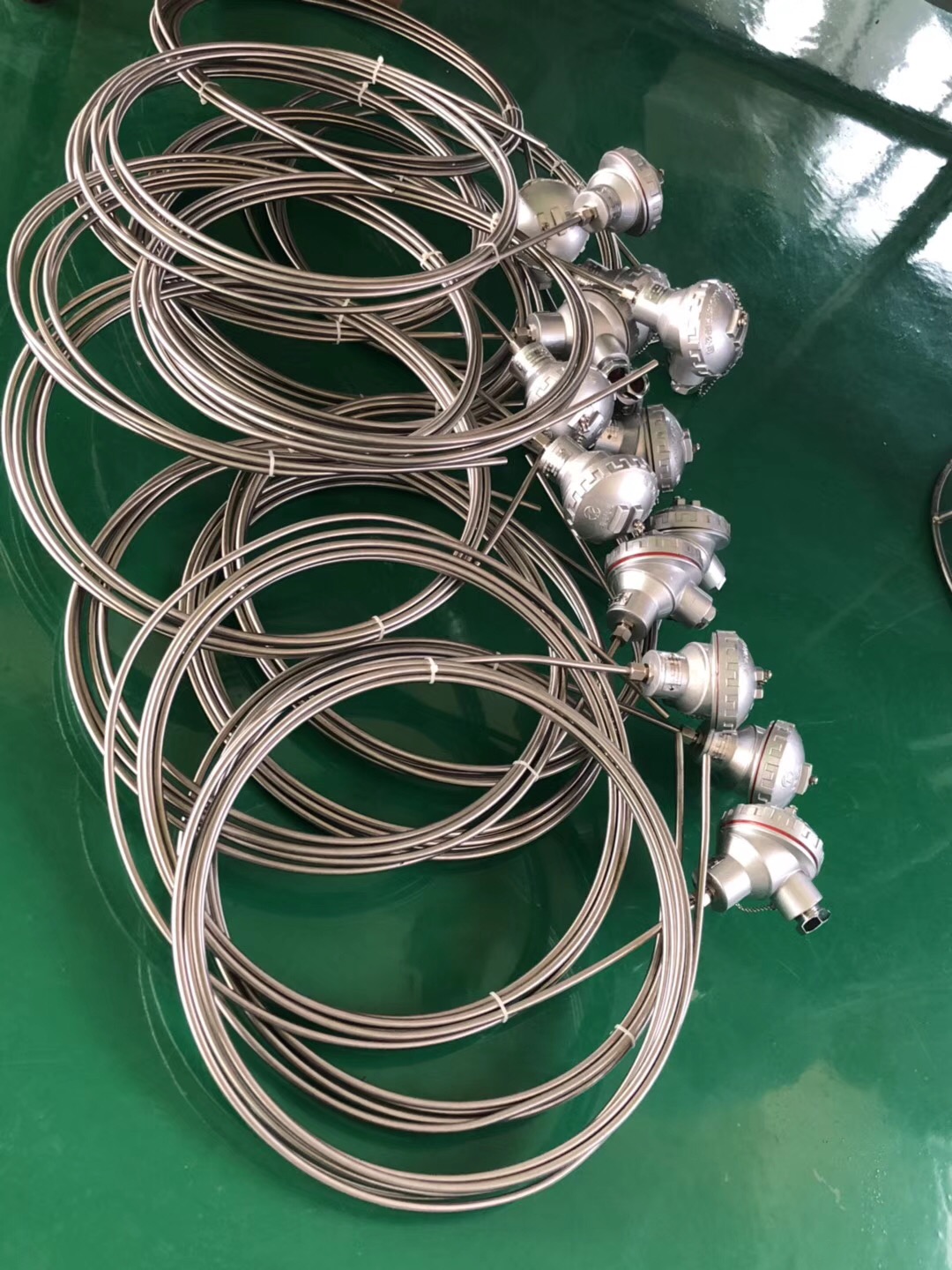 五,铠装热电阻:这类热电阻相对于普通装配式热电阻具有抗震和高适用性的特点,可适用于更多复杂工况,比如:1、超长度测量,探头长度超过10米甚至20米的现场,铠装热电阻探头可弯曲,可以盘装运输,解决超长无法运输的窘境;2、铠装热电阻由于保护管壁较薄,所以测量灵敏度高高于普通热电阻,铠装热电阻也可以做成防腐或防爆热电阻。